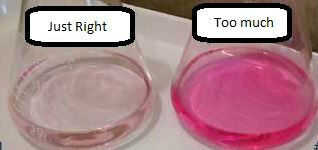 5. 38 ml, controlar cada gota y agitar el vaso un poco para ver si un leve color rosa permanece en la solución o se disipa a incoloro (un color rosa más oscuro significa que la solución se satura más allá del punto de equilibrio).