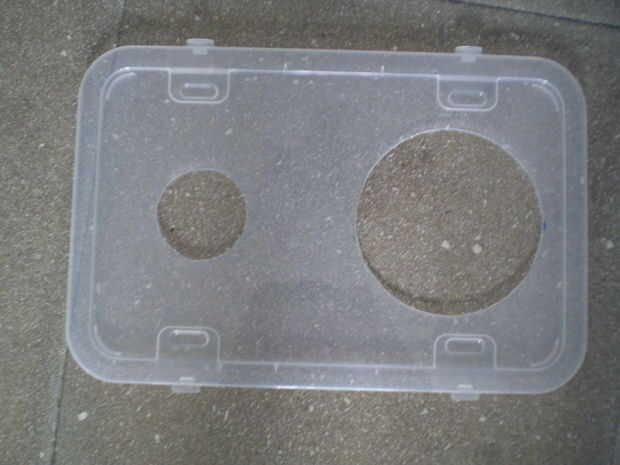 Ahora hacer otro agujero en la tapa que se adapta a su codo. Para colocar el pegamento de codo un pequeño trozo de tubo de pvc en el codo, pasar a través del codo el agujero y utilice una abrazadera de tubo (opcional) para garantizar la ventilación. Esa manera usted puede moverlo a soplar por todas partes usted quiere.