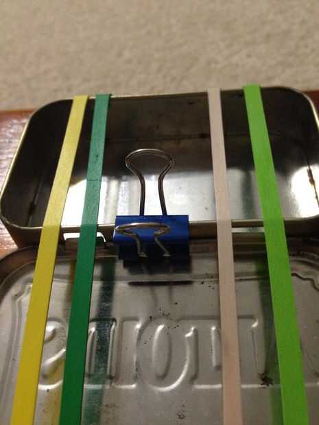 Paso 1: equipo de Se necesita una lata Altoids, cinta pato, clip binder, 3 bandas de goma, tijeras y una cuchara de plástico.Paso 2: Fijación de presilla de Binder Primero recortas pato cinta 2 veces como el estaño, entonces doblarlo y ponerlo hacia