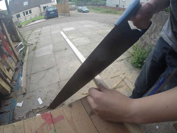 También quiere recortar su 30 1/4" piezas del pino stripwood, lo hice con una sierra de mano que quieras estos cortes para ser tan cuadrado como sea posible.