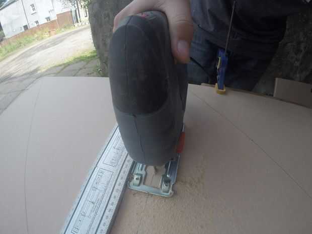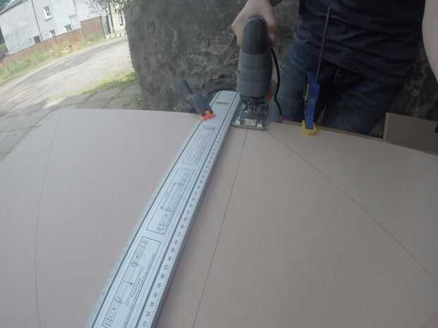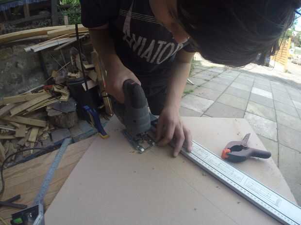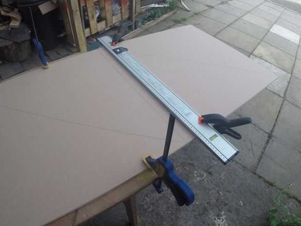 Primero, fije su hoja a la mesa de trabajo y asegúrese de que su seguro. Para hacer un corte recto con mi rompecabezas barato, necesito también fijar una regla a la Junta a utilizar como una guía, aunque una mejor Sierra de calar o una sierra circular no necesita.