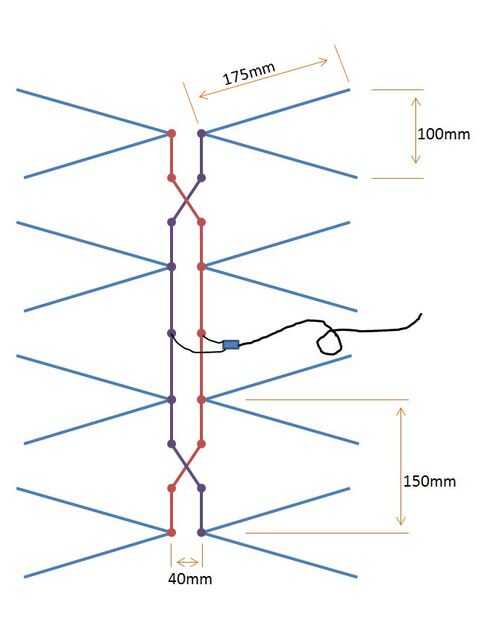 Utilizando alambre o trozos de suspensión o cualquier cosa conductor como el camino rojo y púrpura, montar la antena. Conduce seguro rojo y púrpura a no tocarse, pero que tocan las suspensiones en las arandelas, si usar alambre desnudo aislar puntos donde se cruzan las líneas rojas y púrpuras. Conecte las formas V con tornillos y arandelas. Centavos hacen una lavadora muy barata... sólo cuestan, también, un centavo:)
