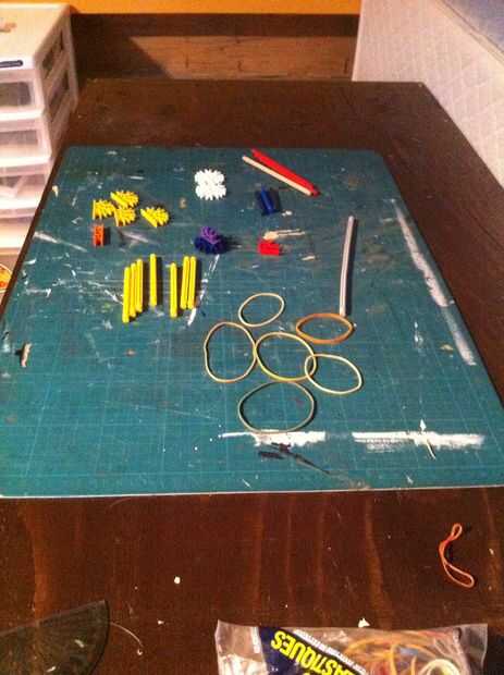 : barras amarillas siete, dos conectores de círculo blanco, tres barras azules, una barra gris, tres barras rojas, conectores rojo uno, cuatro conectores amarillo, un conector naranja, un conector azul púrpura, elásticos