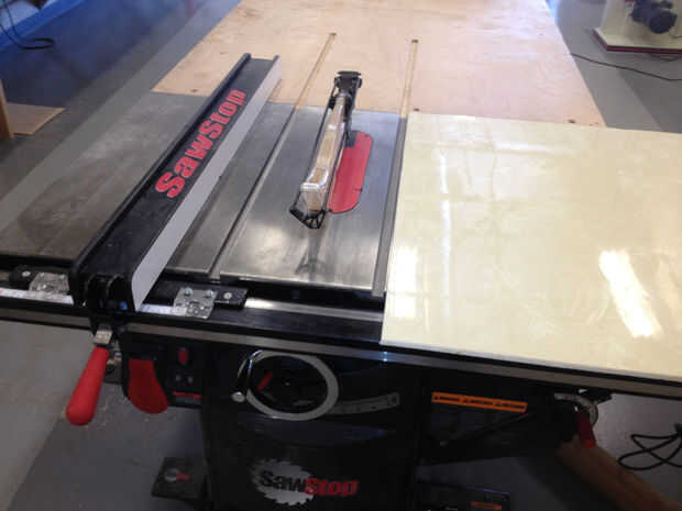 Una vez que la medida fue confirmada por la corte un pedazo de madera a la medida de ancho, procedí a cortar las piezas grandes de material (Foto 3 - 1) En las tiras necesarias (Foto 3 - 2) usando palos de empujar para seguridad.