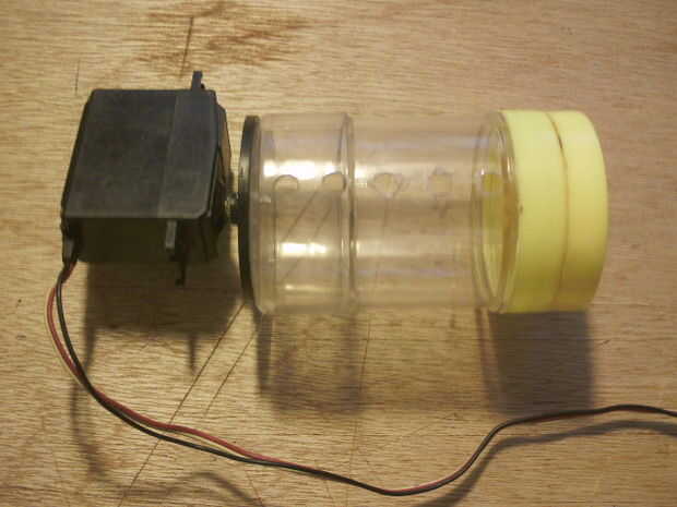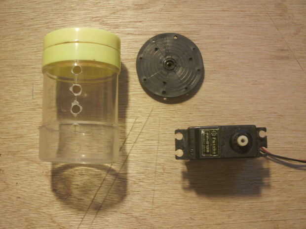 Encontré un viejo tubo de palillo conveniente para el rodillo, necesito el servo y el disco para montar el rodillo. Por supuesto cualquier pieza puede ser usado, más importante para ahorrar agua y ahorrar energía, perforé 5 agujeros de 5mm en el tubo, montado el disco del servo en la parte inferior (no importa arriba o abajo), número de agujeros y de cuán grande es el agujero en cuestión cuántos alimentos a dar.