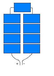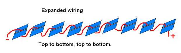 Soldar las células en serie. Eso significa positivo a negativo, positivo a negativo y así sucesivamente. La parte superior de la celda es el extremo negativo, y la parte inferior es el extremo positivo.