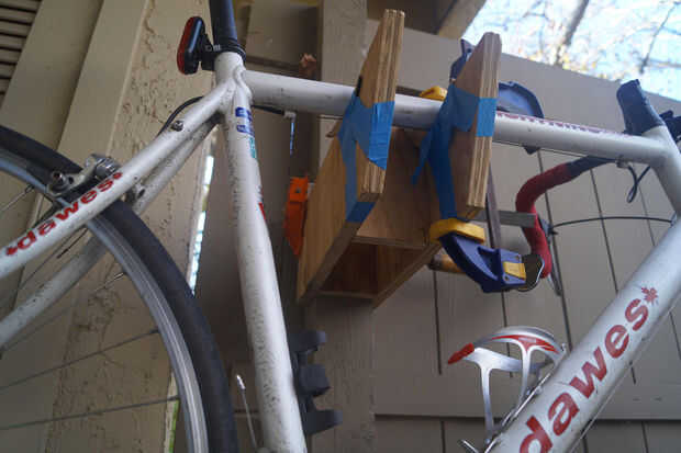 Para proteger el acabado de la bicicleta, grabado algunos cartones para los divots donde se fija el marco de la bici. Unas vueltas de cinta adhesiva o algo más elegante lo justo así.