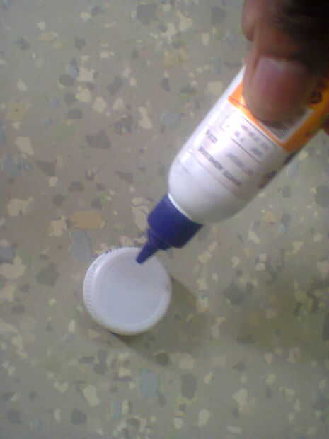 Tomar la tapa de la botella y aplique el pegamento en el lado con mayor superficie, que es la parte superior de la tapa... En la foto se puede ver que he aplicado el pegamento en el otro lado... Porque será looke más atractiva en ese lado. Aplicar el pegamento en otras tapas también.