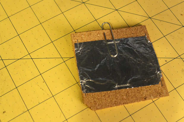 Clip de papel un corcho tablero para que el clip está cerca de un borde. Clip de papel a bordo de otro corcho para que el clip está en el centro. Dos clips de papel debe estar tocando el papel de aluminio.