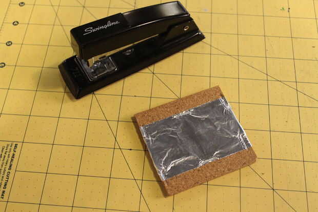 Con una grapadora, grapa los bordes de la hoja de lata para el tablero del corcho.