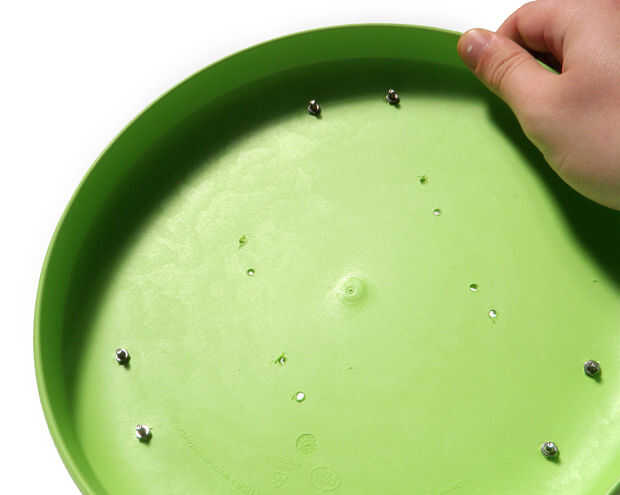 Una serie de 8 agujeros de taladro que puede posteriormente pasar una amarra a través el frisbee y cada esquina del motor del ventilador y volver por el frisbee.