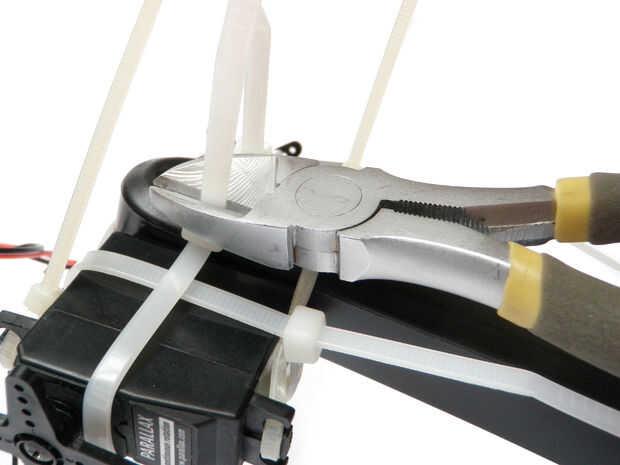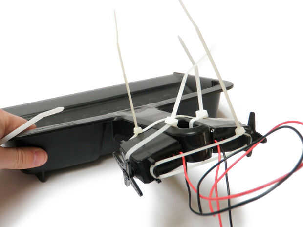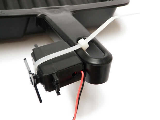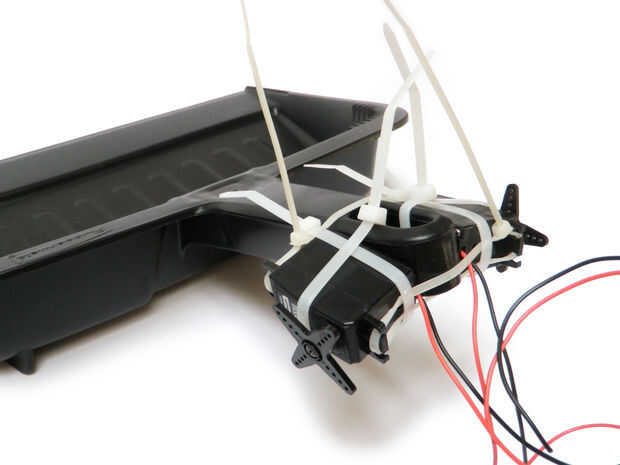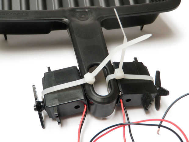 Firmemente zip empate los servos a la manija de la cacerola del polvo que están señalando uno frente a otro.