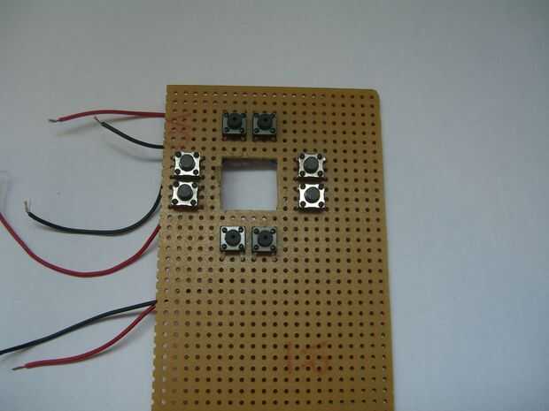 2. poner los pulsadores en la placa, como en la fotografía. la distancia entre 2 pares de oppisite de botones depende del tamaño de la parte 7 *. parte 7 shoud barelly tocar los botones, cuando está en el centro.