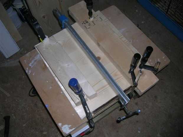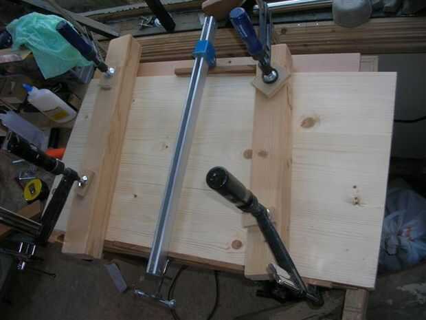 • Sobre una superficie plana utilizar abrazaderas para reunir las piezas, lo que sucederá es que la madera se levante como una banana así que úsenlos 2 longitudes gruesas de madera y pinza empujando hacia abajo la pieza de trabajo.