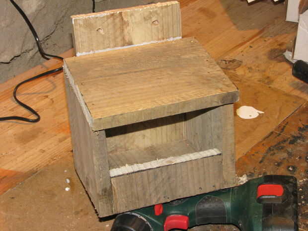 Taladre dos orificios, superior e inferior de la placa de respaldo por lo que puede conectar la caja a una rama de árbol. Si no tienes un taladro, corte dos pares de ranuras a nivel de lados donde estarían los agujeros