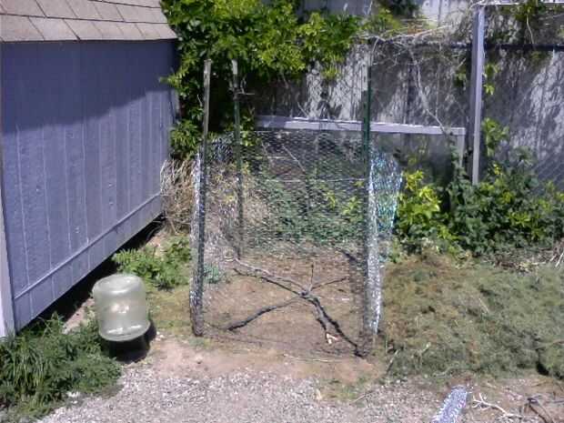 Saqué el cable tan apretados ya que pude, pero esto no es una valla para mantener animales o para sostener cualquier peso, por lo que no necesita ser enseñado totalmente. Después de atar el extremo de la guía (a la guía de sí mismo, completar el aro), até la cerca a los postes con algún alambre de achique. Una vez más, esto no deben ser ajustados o diseñados para cojinete de peso ni nada. Un par de piezas de alambre por post es suficiente, suficiente para evitar el aro levantando los puestos o extendiéndose demasiado con el peso de dentro.