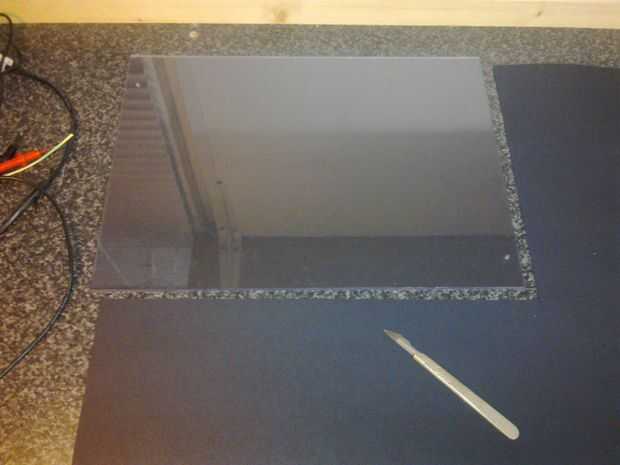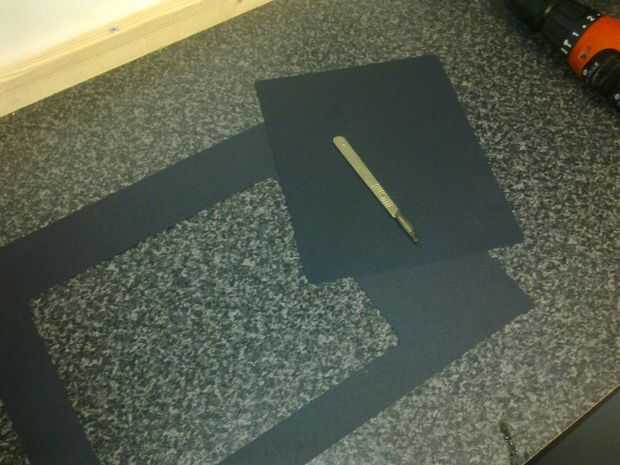 Colocar el plexiglás sobre la tarjeta y con un bisturí afilado cortar alrededor de ella. Ahora debería tener un trozo de cartón negro del mismo tamaño que el metacrilato!
