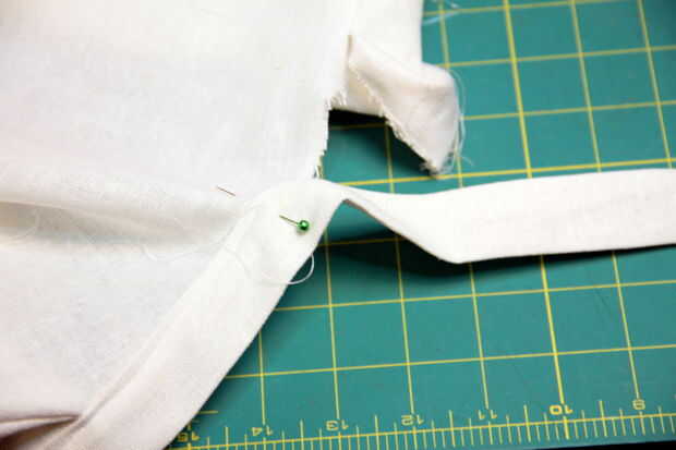 Alinee el centro de la parte posterior de su cuello con el centro del collar. Inserte el crudo cuello en el collar. Coser desde el centro a los extremos.