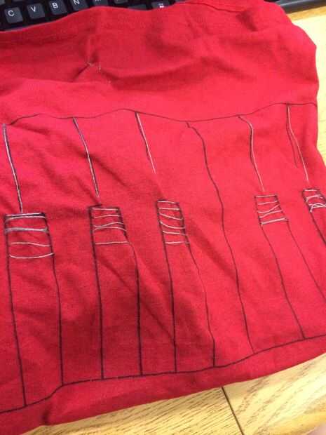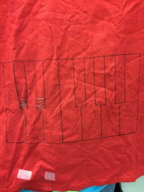 Utilizando la aguja de sus rosca en pasos anteriores con el hilo conductor y la puntada básica, agregar líneas en la parte inferior de las teclas. Estos serán las superficies conductoras que se usan para tocar su piano. Debe tener aproximadamente 3 a 4 pulgadas de hilo al final cuando termines. Se trata de adición de los broches de presión en el paso siguiente.