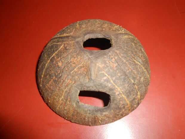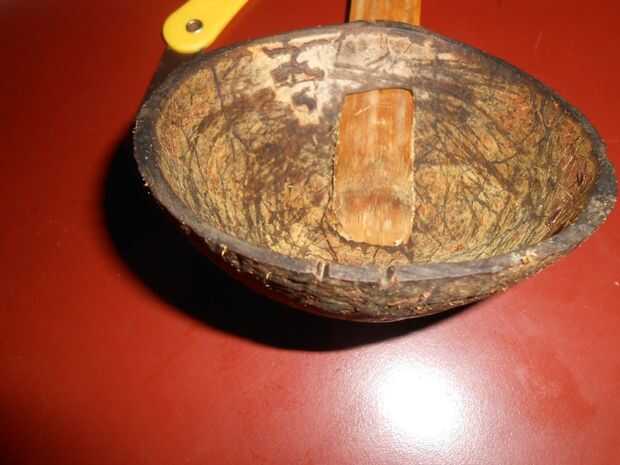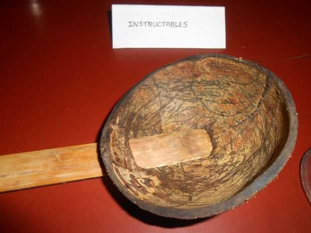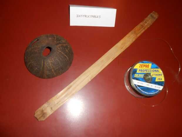 Cortar dos arboledas v pequeña en la cáscara de coco, así como otro extremo del palillo de bambú, esto se hace para que la cadena no se deslice hacia fuera.