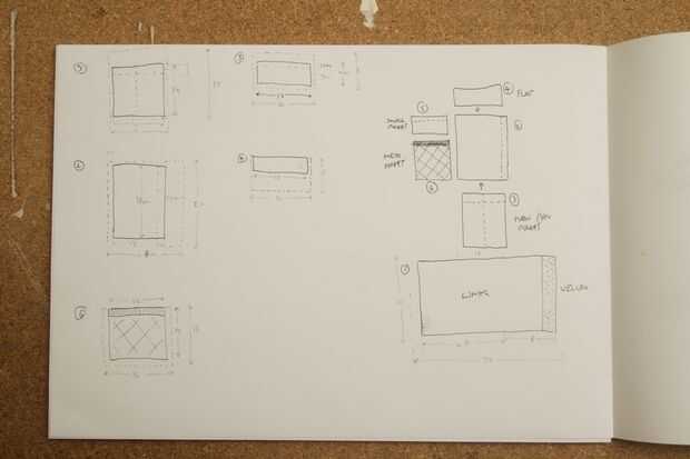 Haber averiguado todos los cambios que quería hacer, trazó el caso entero, cuánto cada pieza de tela que (permitiendo para las costuras y los bordes del bolsillo en donde sea necesario) y marcados y cortar la tela para cada pieza.