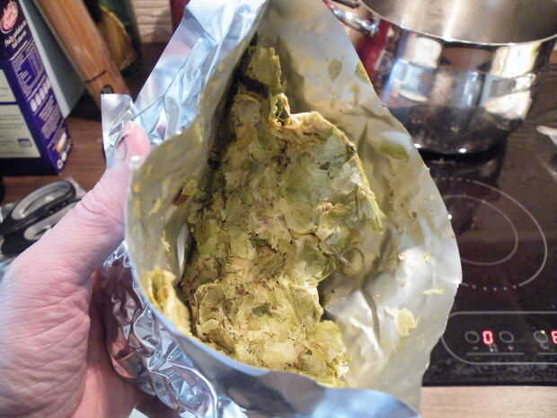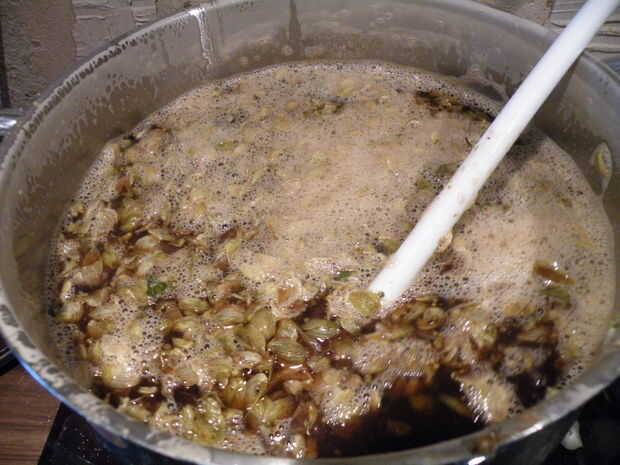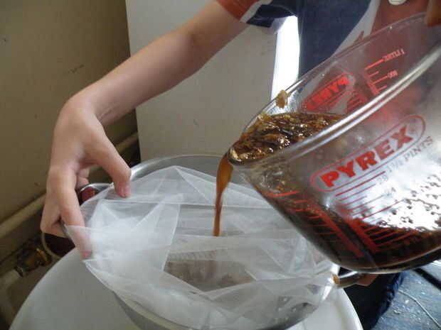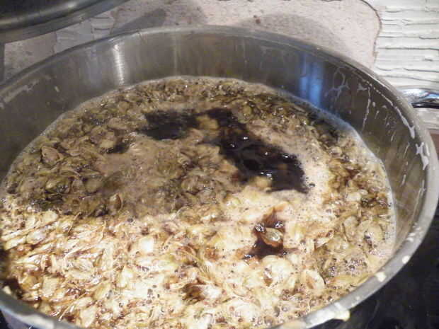 Derramé las última dos macetas en el recipiente de fermentación (ya fría) a través de una bolsa de malla de nylon (esterilizados) en un colador (esterilizada), entonces hervido para arriba otro tres litros para el volumen y vierte a través de los saltos en la bolsa así.
