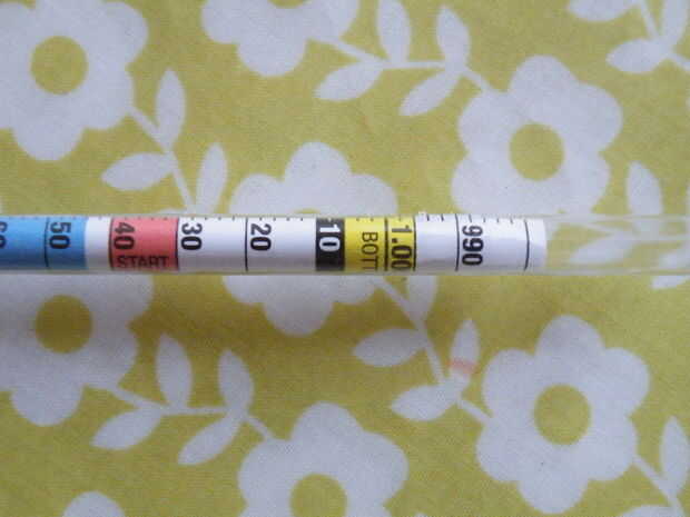 También hay marcas en el hidrómetro para mostrar cuando la cerveza está lista para ser embotellada, junto con una advertencia útil; No botella (o barril) hasta fregaderos hidrómetro 1.006 o botellas estallará.
