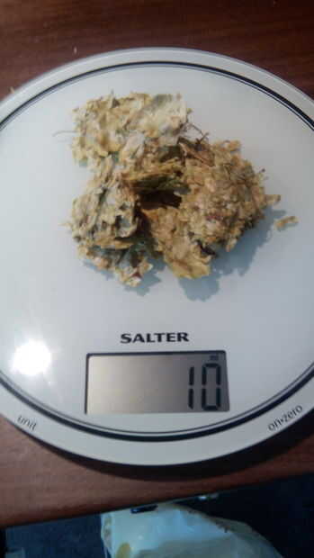 6. pesar saltos de 25g y desmenuzar con la malta. Revuelva hasta que se hunden, luego hervir por 50 minutos.