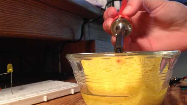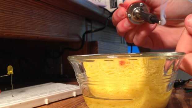Para "lata" un hierro de soldadura, conectarlo (la luz se enciende cuando está conectado) y esperar un par de minutos hasta que esté lo suficientemente caliente como para derretir la soldadura. Nota importante de seguridad: no tocar cualquier METAL parte de la soldadura de hierroes extremadamente caliente y te quemará. Mientras esperas obtener la esponja empapada, para no quemarlo. Finalmente sólo derretir alguna soldadura en el hierro y límpielo en la esponja hasta que la punta del soldador es agradable y brillante.