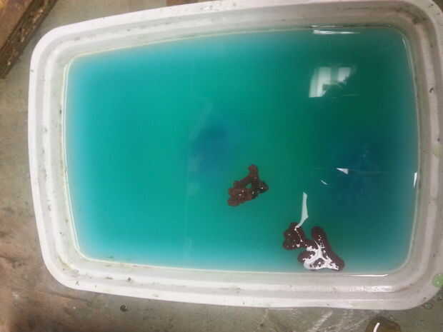 Seguir viendo la pieza hasta que la etch es tan profunda como quieras. Cuando haya terminado, tire y lávela con jabón bajo bajo agua corriente. Esto debe eliminar cualquier solución y detener el proceso de grabado. Los colgantes en mis cuadros grabado durante 8-10 horas.