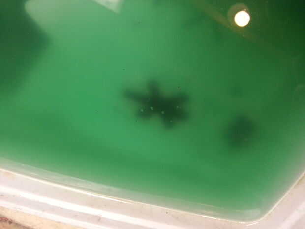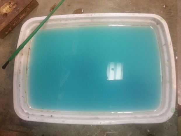 La solución de grabado será azulado verde cuando se mezcla. El proceso de grabado es impulsado por la ración de los iones de cobre al aluminio, así la solución más que hay en el tanque de decapado, más rápido será grabar el aluminio. Usar platos de plástico reciclados para aguafuerte. Llene su tanque grabado con solución y dejar caer su pintado de aluminio. Etch tiempo dependerá el aluminio, la concentración de la solución de la aguafuerte, volumen, temperatura y muchas otras variables menores. Supervisar el grabado hasta que tengas una idea de cómo va. Una nube oscura flluffy de cobre se forma sobre las áreas expuestas de aluminio. Utilizar un cepillo pequeño para remover esta lejos. La solución con rayar el aluminio como hay opper en la solución. Si usted ve la solución de grabado a un color claro, añadir más sulfato de cobre y volver a mezclar la solución