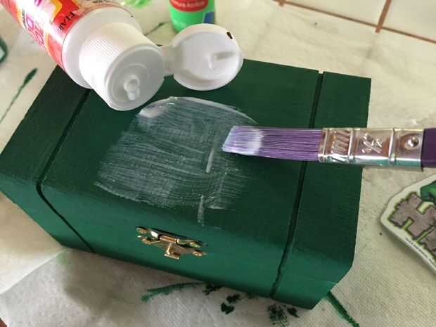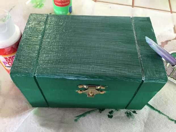 Cubrir la caja con una capa de pegamento Mod Podge (se seca claro). Sugiero dejar el borde interior de la caja sin recubrimiento por lo que no es difícil de abrir.