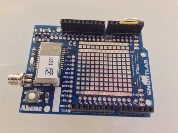 El aquenio es un escudo de Arduino de la experimentación de SnootLab con el TD1208 SoC (System on Chip) en él. El TD1208 es un transceptor de radio certificado SigFox combinado con un ARM Cortex M3, que implementa la pila de módem de telecomunicaciones para el envío de valores a la SigFox red de telecomunicaciones y también incluye capacidades de I2C para sensores de IoT, al lado de su vínculo de módem serial.