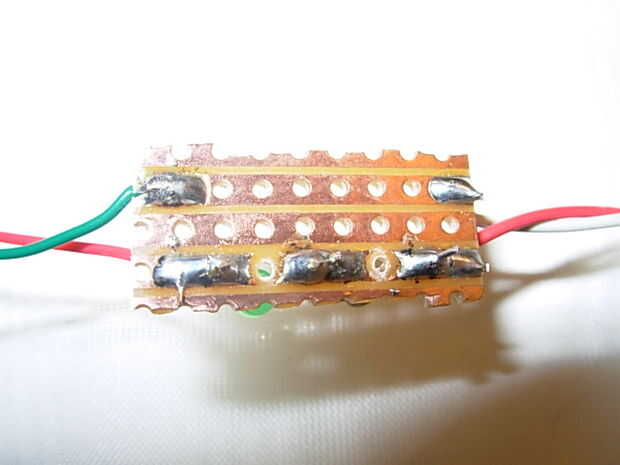 Empezar por romper el cobre como lo he hecho en la imagen. Luego colocar y soldar los cables positivos con clip de la batería y los clips de cocodrilo lagarto en la tira con las pistas rotas, como lo he hecho. Entonces empezar por colocar el resistor de 390 ohm dejando que una rotura en el cobre entre los dos plomos en la pista rota (al lado del clip de la batería) y en soldadura. Entonces lugar el LED en el quebrado pista (la manera positiva alrededor y al lado de la pinza de cocodrilo) y soldadura en dejar una pausa en el cobre entre los dos plomos.