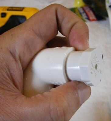 Usando cemento y cartilla de PVC, pegue el enchufe en un codo 45 o 90 grados, dependiendo de si desea rociar la sangre en un ángulo ascendente desde su posición de montaje o no.
