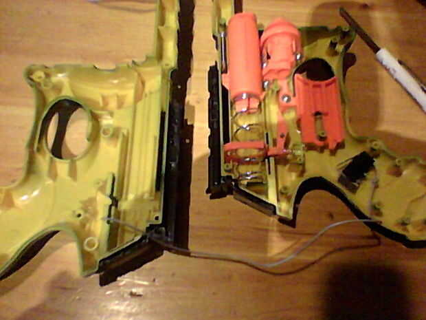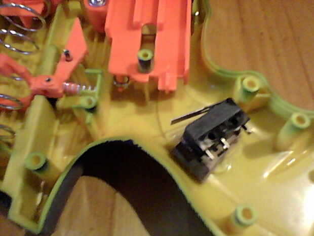 Para hacer el visor de fotos cambiar la pantalla cuando se disparó la pistola Nerf, pienso montar un interruptor dentro del mango de la pistola de Nerf. El interruptor es una pequeño "hoja" o "micro" del interruptor de la clase que se puede encontrar en Radioshack o pedir a través de empresas de electrónica como Sparkfun. Está montado en el mango de este Maverick para que cuando el gatillo completamente hacia atrás, el conmutador está en posición (alguna ligera modificación plástica participó para asegurarse de que el interruptor no coge en el gatillo). Los tres puntos de metal del interruptor son común, normalmente abierto y normalmente cerrado. Soldar dos cables al interruptor, uno para el común y uno normalmente abierto, para que el interruptor se cierra cuando se presiona el gatillo de la pistola. Esto imita el funcionamiento de los botones en el llavero de la foto. Los cables se dirigen hacia fuera a través de un pequeño agujero en el mango.
