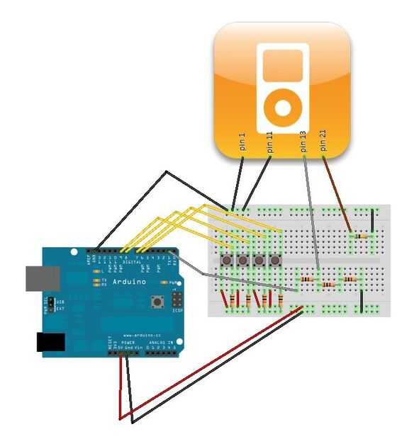 Deben poner a tierra ambos iPod los pines 1 y 11 a arduino. (A los recolectores de nit, sé cosas diferentes sobre el pin 11 del estado de las referencias, pero lo de puesta a tierra parece no tener ningún efecto sobre este proyecto.)