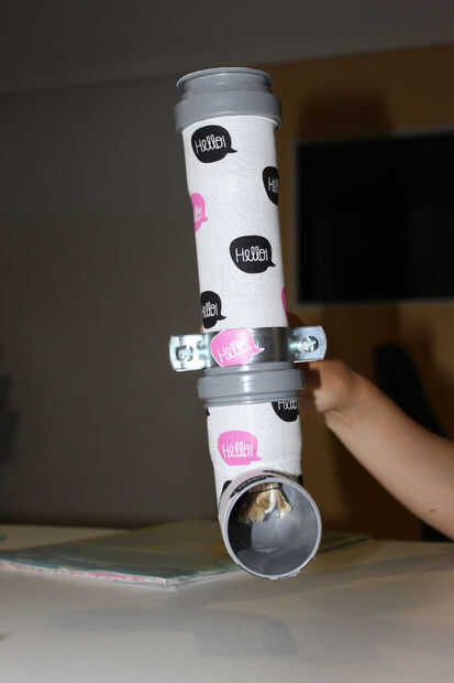 Entonces todo lo que tenía que hacer era conectar los pedazos de tubo, corte unos trozos de la hoja adhesiva y envuélvalo alrededor de los tubos. Para asegurar la bolsa catnip pegué la banda elástica entre tubo y tapa. De esta manera será más fácil quitar o reparar o simplemente usarlo como un juguete separado.