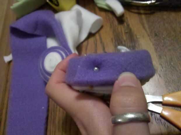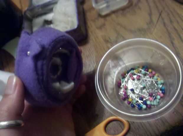 Terminar! Coincida con la circunferencia a su objeto (lo hice por prueba y error) y luego añadir un giro extra o dos para que sea un ajuste ceñido, poner una clavija final en él para sostener a la tela en su lugar y recorte el exceso.