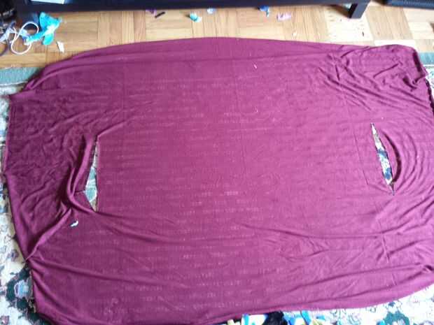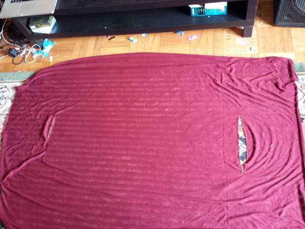 Medir un tercio del camino en el lado de la tela doblada en todos los pliegues están juntos. Se trata de la colocación de las aberturas de los agujeros del brazo. En este punto, corte una abertura de 6 pulgadas de largo a través de todas las capas de tela. Al desplegarlo, debería verse como las dos últimas imágenes de este paso.