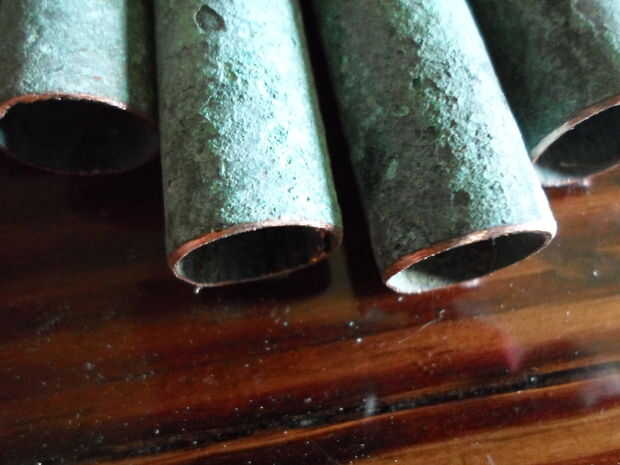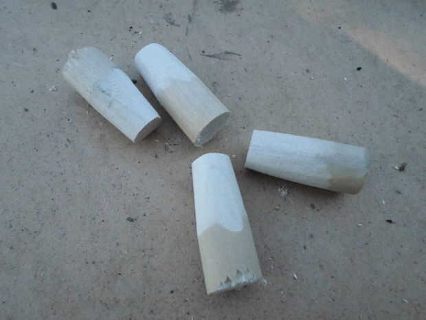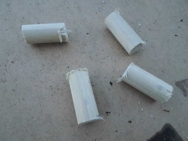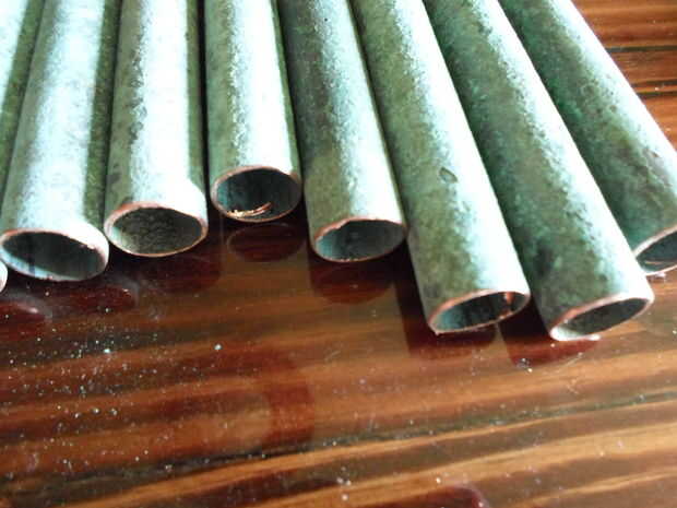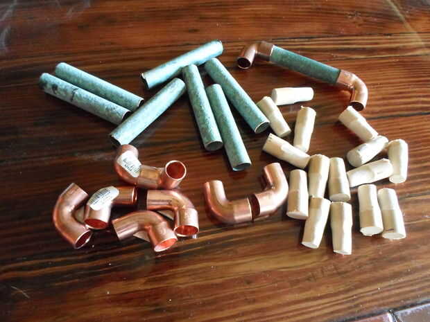 Comienza por cortar el tubo a la longitud que desee su tira. Al calcular la longitud total, recuerde tener en cuenta las pulgadas o lo se agregarán los codos. Una vez cortadas, elimine las rebabas y biselar el borde. A continuación cortar la espiga en 1 1/2" piezas y un extremo para caber dentro del pequeño extremo del codo de la forma cónica. Desea que la madera sea visible desde el lado opuesto. El último paso es para desbaste hasta el interior del gran final del codo. Más adelante usaremos epoxy para fijar los tacos y esto lo ayudará a cumplir con el cobre.