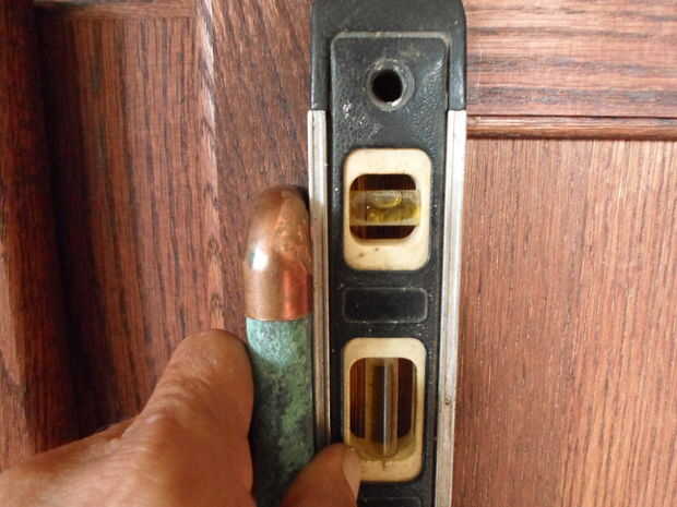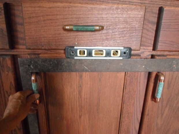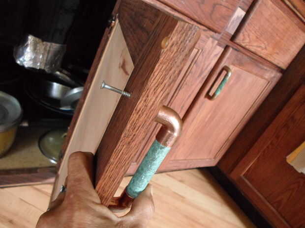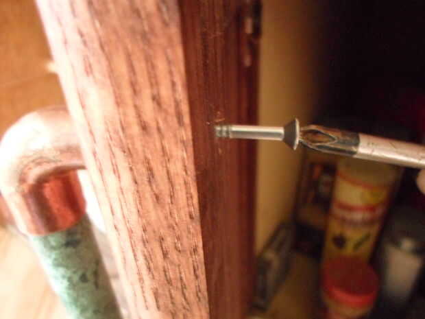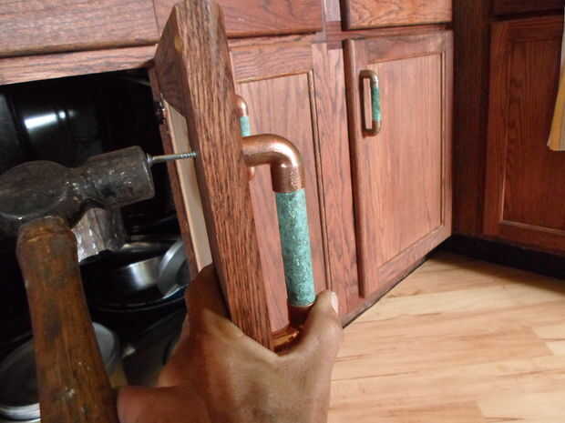 Empezar por perforación de los orificios para los tirones. Medir de centro a centro de los tacos y usar esto para los agujeros del espacio. No tiene que ser perfecto pero debe ser lo más precisos posible. Debido a la forma que fije la tira tiene un margen un poco con esto. Sólo trate de mantener uniforme y recto. Ya que todos los tiradores tienen la misma longitud, o muy cerca de él, hice una plantilla de papel para colocar mis agujeros. A continuación poner los tornillos en el agujero hasta que apenas sobresale a través de. Empuñadura de la puerta, usando un nivel para mantenerlo recto, luego mientras sostiene en su lugar, golpee los tornillos para marcar la espiga. Usando esa marca como una guía del taladro un orificio piloto para el tornillo. Entonces sencillamente el tirón en su lugar y atornille los tornillos. Hacer un tirón a la vez para asegurarse de que sus orificios se alineen. Después de instalar el primer tirón utilice un nivel para mantenerlos a la misma altura. Entonces siéntese y disfrute su nueva tira personalizado!