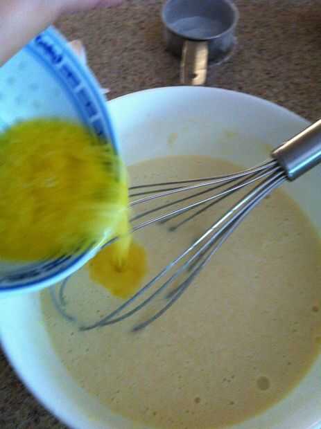 Derecho antes de que se caliente la mezcla Vierta la mantequilla derretida y bate. Calor de la estufa en medio bajo.