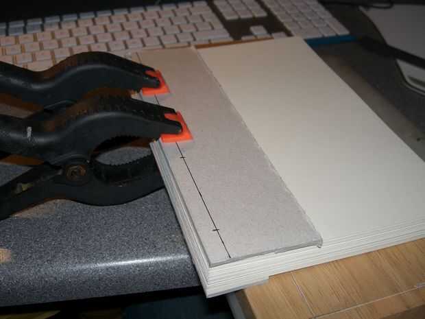 Imagen 1 - crear una plantilla de perforación para su tamaño de papel, cortar un trozo de cartón a la misma longitud que páginas, marca 20mm de cada extremo, entonces esto se dividen en tres secciones para darle dos puntos más de perforación.