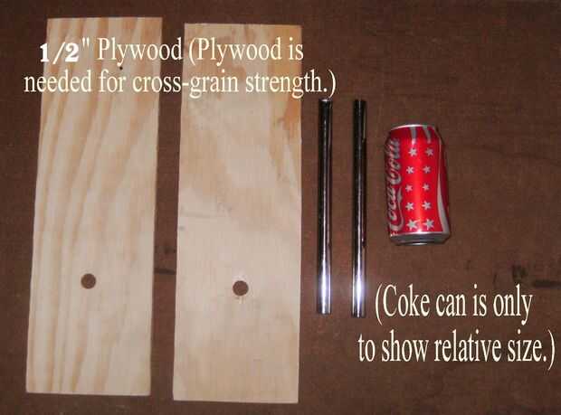 Utilizan chatarra 1/2" madera contrachapada (originalmente dije era 3/8", pero después de cuidado de medir con una regla real y todo, me pareció de hecho 1/2") y algunos tubos de acero de desecho. Cualquier tubería de diámetro va a hacer. Perfore agujeros en la madera del mismo diámetro que el tubo. Los agujeros deben ser lo suficientemente grandes para tubo Deslice libremente, pero no demasiado flojo, o perderá cierta estabilidad. El tamaño de la madera y la longitud del tubo pueden variar dependiendo de sus necesidades. Este tamaño fácilmente tendrá 50 watt combos.