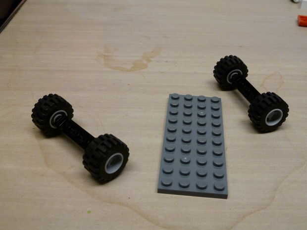 Haz la Junta de Lego plana gris de 10 x 4 y los ejes de dos 4 x 1 negro con los neumáticos conectados a ellos.