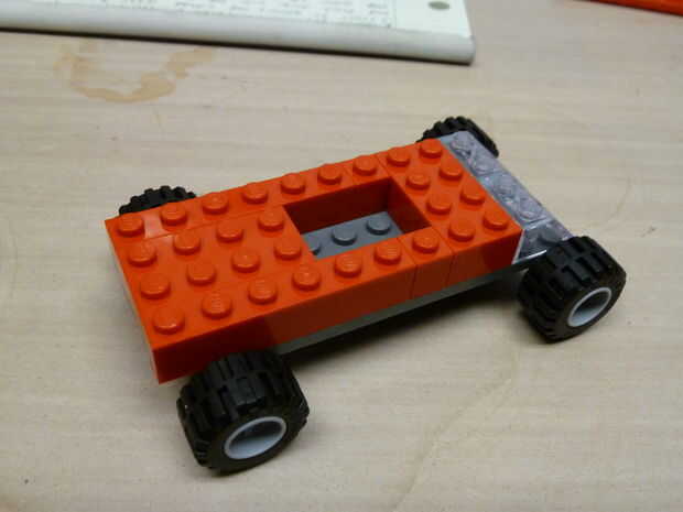 Encontrar el rojo dos 1 x 1 piezas de Lego y ponerlos directamente detrás el rojo 4 x 2 bloques para que queden en los bordes muy de cartón gris. Encontrar las dos piezas de 6 x 1 rojo y ponerlos directamente detrás de los dos bloques rojos de 1 x 1. Encuentra un bloque rojo 4 x 2 color rojo y lo puso entre los dos bloques rojos de 6 x 1.