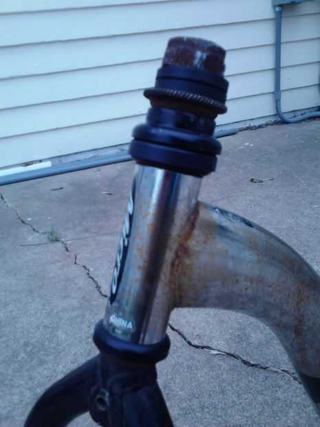 Ahora, pone en el segundo conjunto de rodamientos de bolas, seguido por la tuerca de la bicicleta de montaña. Tuve que usar algunos espaciadores de otro proyecto de la bici para tener en cuenta la longitud del tubo de dirección.