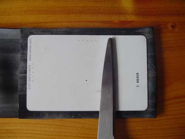 Doble la derecha 11 cm (4 5/16") a la izquierda, en la parte superior el resto del tubo interior. Poner un crédito tarjeta o similar en la parte superior y tratar de ajuste (Fig. 1). Debe haber unos 5 mm (3/16") a la derecha de la tarjeta (para grapas) y la misma distancia a la izquierda. Si no hay, ajuste hasta que se ve bien.