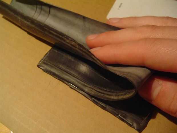En primer lugar, vamos a hacer un extraño pliegue, como en la primera imagen. Doblar la parte sin terminar para la derecha y luego doblar de nuevo a la izquierda. El pliegue debe alinearse con la parte ya terminada de la cartera.
